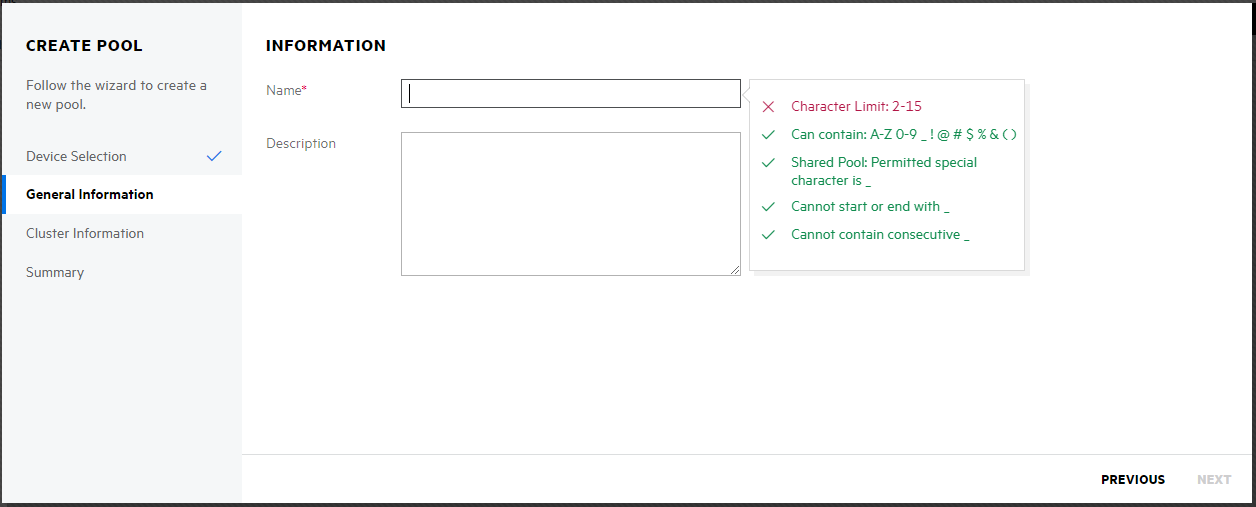 5. On the INFORMATION page, specify a name for the new pool, then click NEXT.