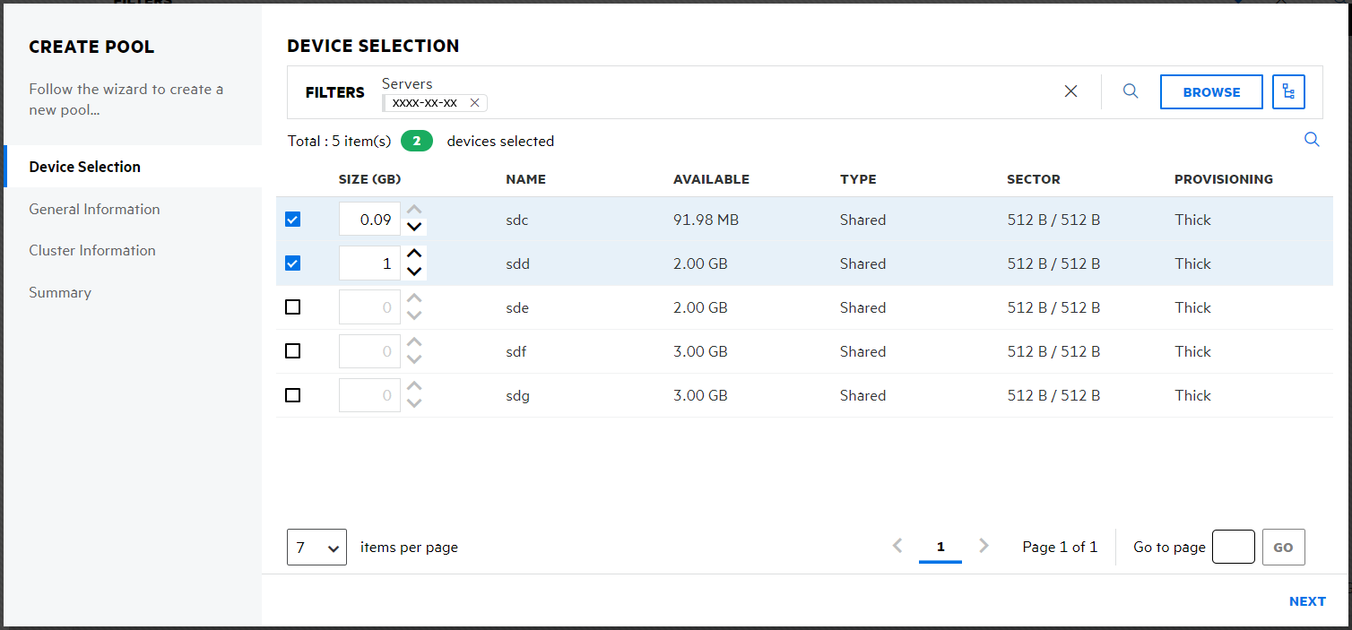 4. Specify the device space up to the free space available on the devices for the pool, and then click NEXT.
