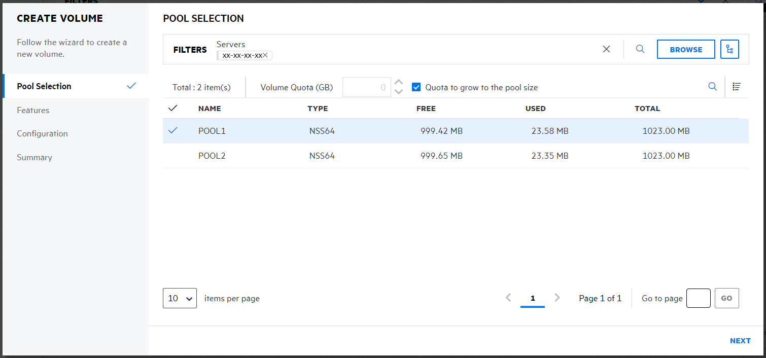 3. On the POOL SELECTION page, search or browse the server to select the pool where you want the new volume to reside, and click NEXT.