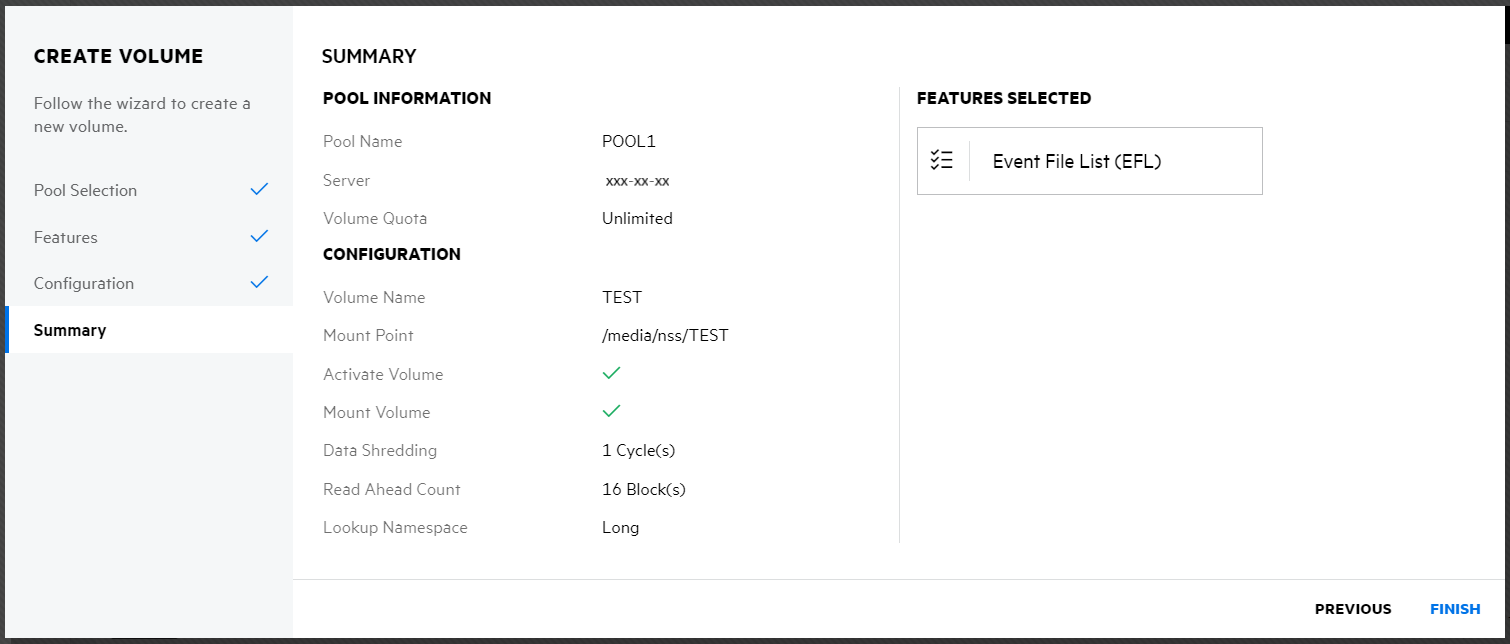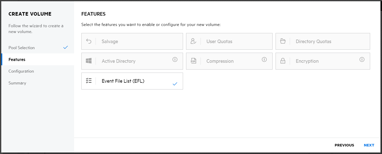 4. On the FEATURES page, select the features you want to enable for the new volume, and click NEXT.
