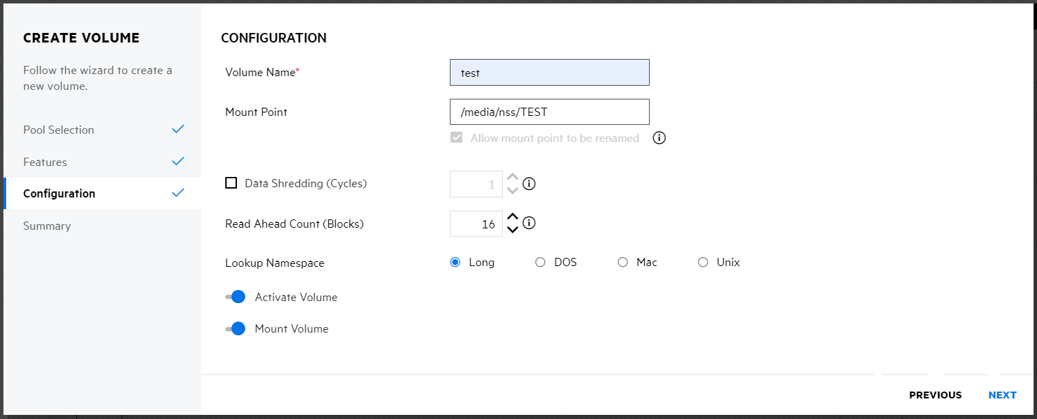 5. On the CONFIGURATION page, specify a name for the new volume, and click NEXT.