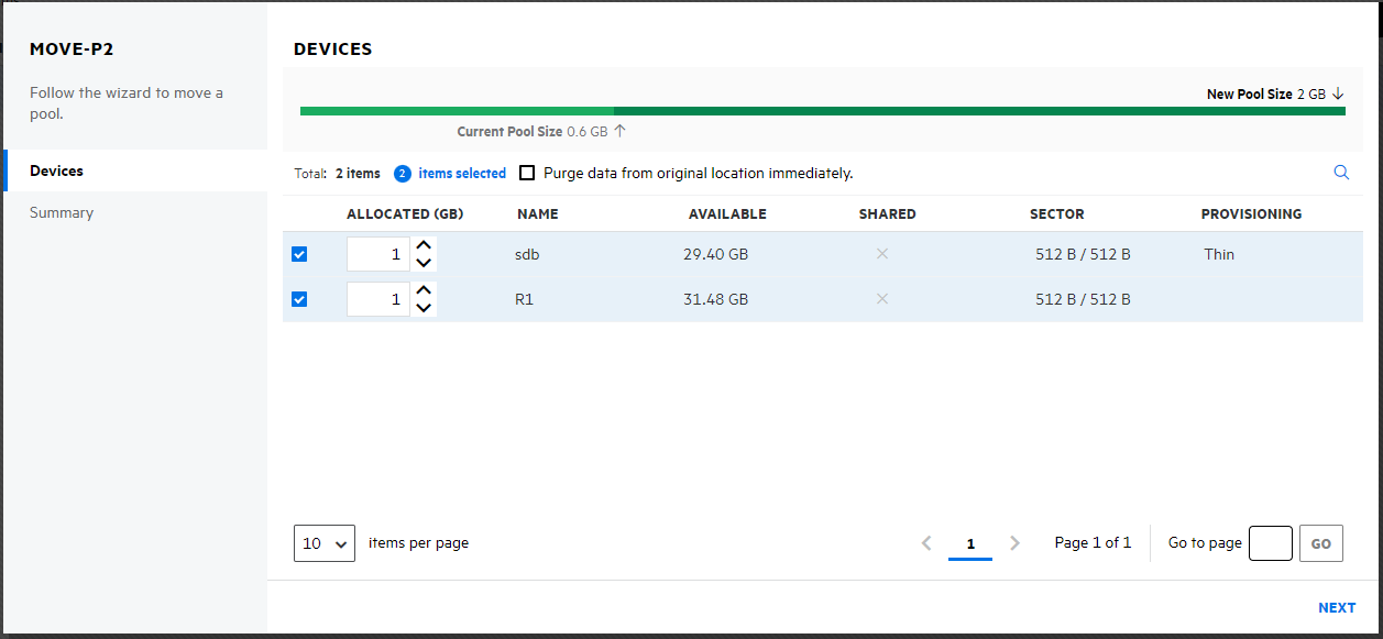 Select the device(s), specify the required allocated size for the selected device(s), and then click NEXT.