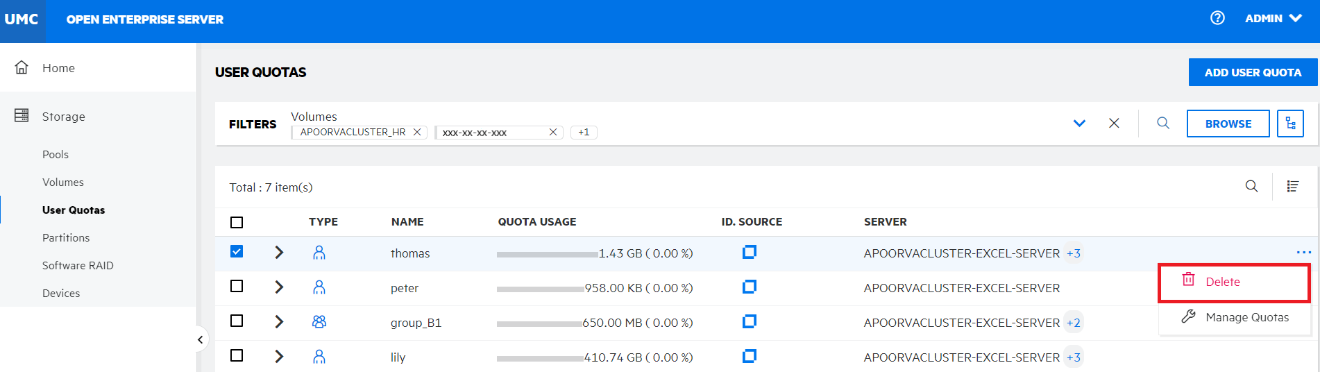 Search or browse the volumes to list the user quotas associated with them.