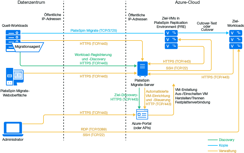 Sie können den PlateSpin Migrate-Server entweder vor Ort im Rechenzentrum, in dem sich die Ursprungs-Workloads befinden, oder in der geeigneten Microsoft Azure-Cloud-Umgebung (globale Azure-Cloud oder unabhängige chinesische Azure-Cloud) bereitstellen.