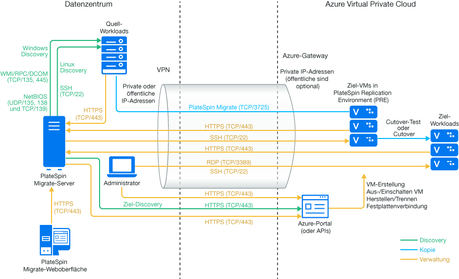 HINWEIS:Abbildung 9-1 zeigt die automatisierte Ermittlung und die Netzwerkanforderungen für Windows- und Linux-Workloads. Alternativ können Sie den Workload mit dem Migrate Agent auf dem Ursprungs-Workload registrieren und seine Inventardetails per HTTPS (TCP/443) an den PlateSpin Migrate-Server senden. Weitere Informationen hierzu finden Sie unter Abschnitt 2.6.2, Voraussetzungen für die Workload-Registrierung und Abschnitt 22.7, Registrieren von Workloads und Ermitteln der Details im Migrate Agent.