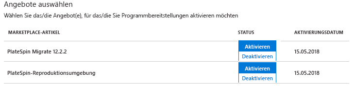 7. Ändern Sie für jede Azure-Subscription, die Migrationen mit PlateSpin durchführt, unter Angebote auswählen den Status der Reproduktionsumgebung von Deaktivieren zu Aktivieren.