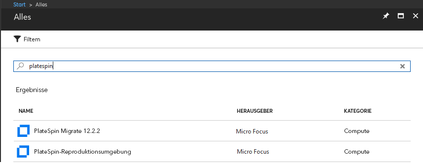 2. Klicken Sie im Portalmenü auf Neu und durchsuchen Sie Azure Marketplace nach PlateSpin-Images. Geben Sie platespin im Filter „Alles“ ein.