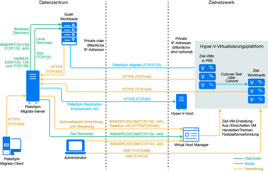 HINWEIS:Abbildung 14-1 und Abbildung 14-2 zeigen die automatisierte Ermittlung und die Netzwerkanforderungen für Windows- und Linux-Workloads. Alternativ können Sie den Workload mit dem Migrate Agent auf dem Ursprungs-Workload registrieren und seine Inventardetails per HTTPS (TCP/443) an den PlateSpin Migrate-Server senden. Weitere Informationen hierzu finden Sie unter Abschnitt 2.6.2, Voraussetzungen für die Workload-Registrierung und Abschnitt 22.7, Registrieren von Workloads und Ermitteln der Details im Migrate Agent.