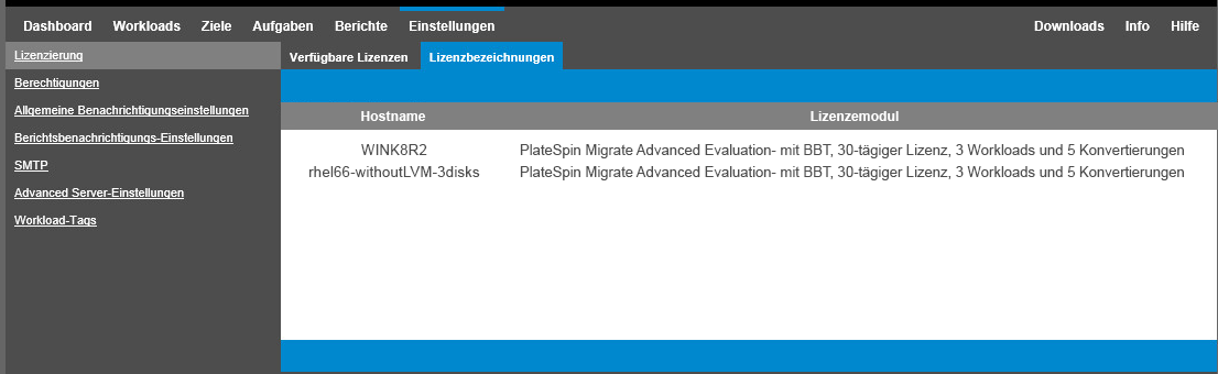 Klicken Sie auf der PlateSpin Migrate-Weboberfläche auf Einstellungen > Lizenzierung > Lizenzbezeichnungen, um Lizenzzuweisungen für Workloads anzuzeigen.