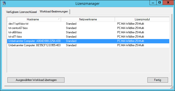 Wählen Sie auf der Registerkarte Workload-Bestimmungen des Lizenzmanagers den erforderlichen Workload aus und klicken Sie auf Ausgewählten Workload übertragen.