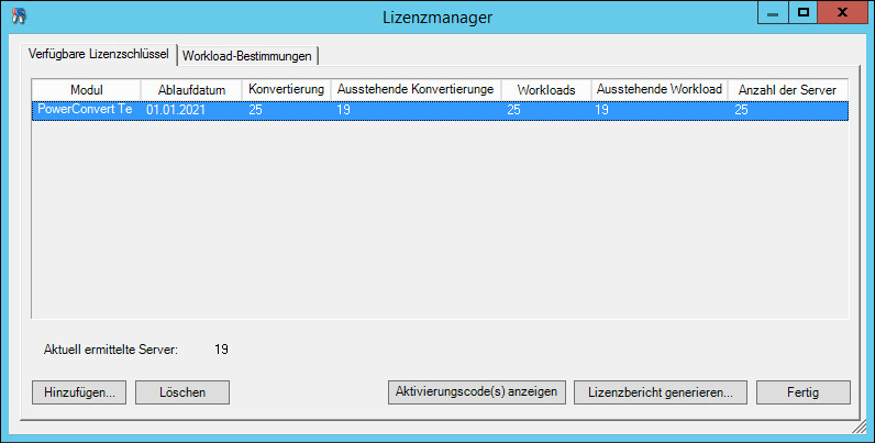 Auf der Registerkarte „Lizenzierung“ wird der Lizenzname (Modul) zusammen mit dem Aktivierungscode, dem Ablaufdatum und Informationen zu Berechtigungen (verfügbare Workload-Lizenzen, verwendete Workload-Lizenzen, verbleibende Workload-Lizenzen, verfügbare Konvertierungen, verwendete Konvertierungen und verbleibende Konvertierungen) für die Workload-Migration angezeigt.
