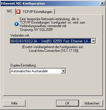 Verbinden mit: Wenn mehrere Netzwerkadapter vorhanden sind, wählen Sie den Adapter aus, der sowohl mit dem PlateSpin-Server als auch mit dem Ziel kommunizieren kann. Duplex-Einstellung: Verwenden Sie die Dropdown-Liste, um die Duplexeinstellung für Netzwerkkarten auszuwählen. Diese muss mit der Duplexeinstellung für den Switch übereinstimmen, mit dem die Netzwerkschnittstelle verbunden ist. Wenn der Ursprung mit Switch-Ports verbunden ist, die auf 100-Mbit-Vollduplex eingestellt sind und nicht auf automatische Aushandlung geändert werden können, wählen Sie NIC in Vollduplex erzwingen. Registerkarte TCP/IP-Einstellungen: Klicken Sie auf diese Registerkarte, um auf die TCP/IP- und erweiterte Netzwerkeinstellungen zuzugreifen. Weitere Informationen hierzu finden Sie unter TCP/IP- und erweiterte Netzwerkeinstellungen. |