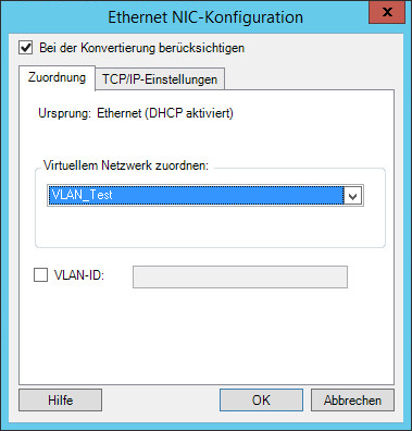 Virtuellem Netzwerk zuordnen: Wählen Sie in der Dropdown-Liste den virtuellen Switch oder das virtuelle Netzwerk aus, der bzw. das für die Kommunikation während einer Offline-Migration verwendet werden soll. Wenn mehrere virtuelle Netzwerkadapter vorhanden sind, wählen Sie den Adapter aus, der sowohl mit dem PlateSpin-Server als auch mit dem Ursprungscomputer kommunizieren kann. Dieses Netzwerk kann sich von dem Netzwerk unterscheiden, auf dem die Ziel-VM nach der Migration ausgeführt wird. VLAN-ID: (Nur für Zielcomputer auf einem Hyper-V-Server) Mit dieser Option geben Sie die virtuelle Netzwerk-ID für den Zielcomputer an. Wenn Sie hier keine ID festlegen, wird standardmäßig die virtuelle Netzwerk-ID des Ursprungscomputers verwendet. Registerkarte TCP/IP-Einstellungen: Klicken Sie auf diese Registerkarte, um auf die TCP/IP- und erweiterte Netzwerkeinstellungen zuzugreifen. Weitere Informationen hierzu finden Sie unter TCP/IP- und erweiterte Netzwerkeinstellungen. |