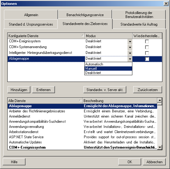 Zurücksetzen: Löscht den Inhalt des oberen Abschnitts. Die Modi aller Dienste im Zielcomputer stimmen mit den Modi aller Dienste im Ursprung überein.