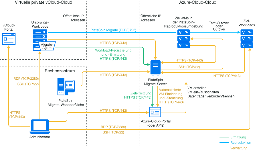 Alternativ können Sie den PlateSpin Migrate-Server aus Azure Marketplace in der Azure-Zielumgebung bereitstellen. Ein VPN ist nicht erforderlich. Sie registrieren Workloads über den Migrate Agent am Cloud-basierten Migrate-Server über eine sichere Kommunikation im öffentlichen Internet. Verwenden Sie die Datenverschlüsselung zur Sicherung von Daten bei Reproduktionen über das öffentliche Internet. Hierfür sind Internetzugriff und öffentliche IP-Adressen erforderlich. Abbildung 12-7 zeigt die Position der verschiedenen Komponenten in der Azure-, vCloud- und Rechenzentrums-Migrationsumgebung und die Kommunikation zwischen ihnen.