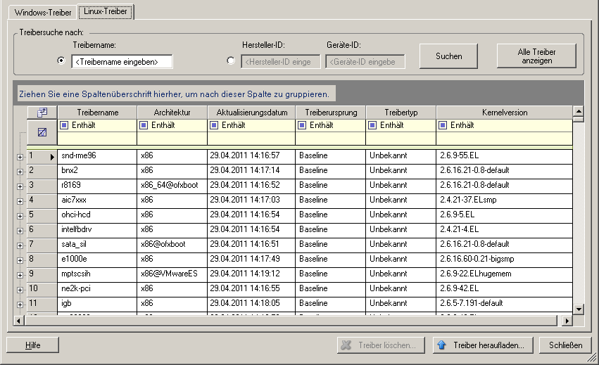 Klicken Sie auf Tools > Gerätetreiber verwalten und wählen Sie die Registerkarte Linux-Treiber aus: