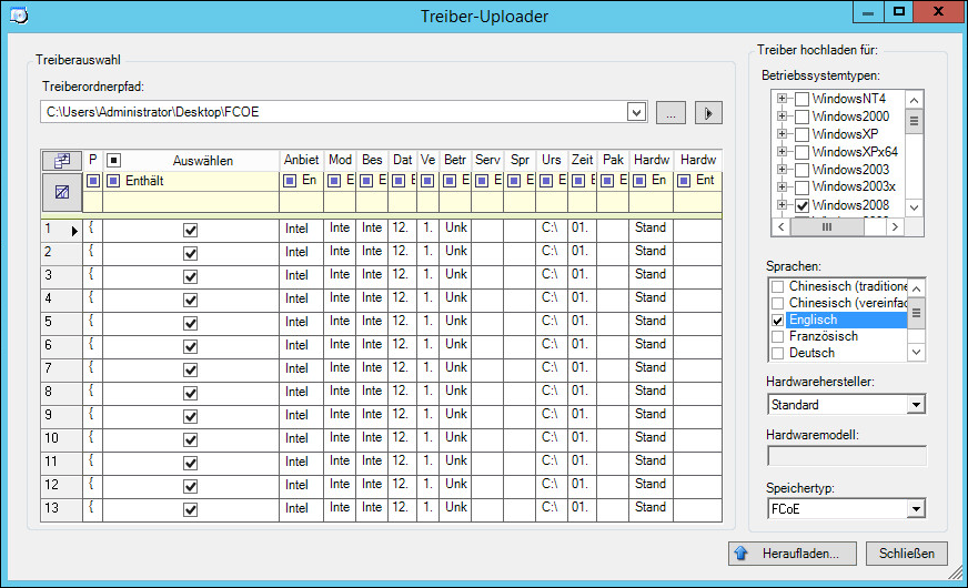 Navigieren Sie zum Ordner, der die erforderlichen Treiberdateien enthält, und wählen Sie den zutreffenden Betriebssystemtyp, die Sprache und die Hardwarehersteller-Optionen aus.