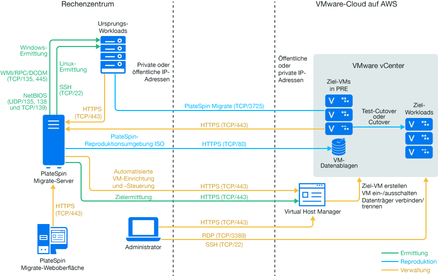 HINWEIS:Abbildung 13-1 zeigt die automatisierte Ermittlung und die Netzwerkanforderungen für Windows- und Linux-Workloads. Alternativ können Sie den Workload mit dem Migrate Agent auf dem Ursprungs-Workload registrieren und seine Inventardetails per HTTPS (TCP/443) an den PlateSpin Migrate-Server senden. Informationen zu Netzwerkanforderungen bei Verwendung von Migrate Agent finden Sie unter Abschnitt 2.6.2, Voraussetzungen für die Workload-Registrierung und Abschnitt 22.7, Registrieren von Workloads und Ermitteln der Details im Migrate Agent.