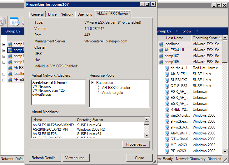 En la ilustración siguiente se muestran las propiedades de un servidor VMware ESX descubierto.