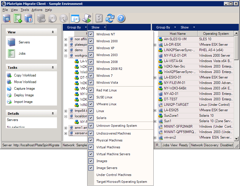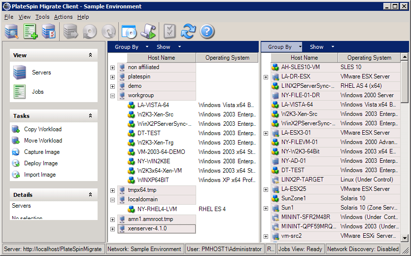 Figura 3-1 Vista Servers (Servidores) del cliente de PlateSpin Migrate