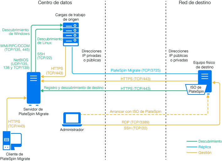 NOTA:la Figura 18-1 muestra el descubrimiento automatizado y los requisitos de red de las cargas de trabajo Windows y Linux. Opcionalmente, puede usar el agente de Migrate en la carga de trabajo de origen para registrar la carga de trabajo y enviar sus datos de inventario al servidor de PlateSpin Migrate mediante HTTPS (TCP/443). Consulte Sección 2.6.2, Requisitos para el registro de la carga de trabajo y Sección 22.7, Registro de cargas de trabajo y descubrimiento de detalles con el agente de Mígrate.