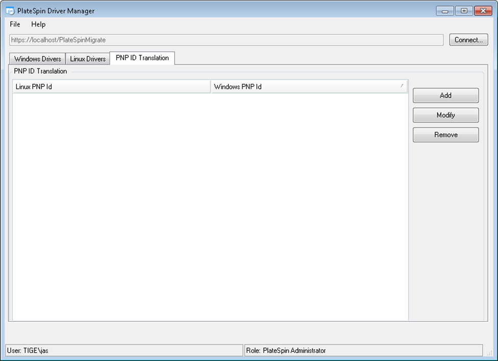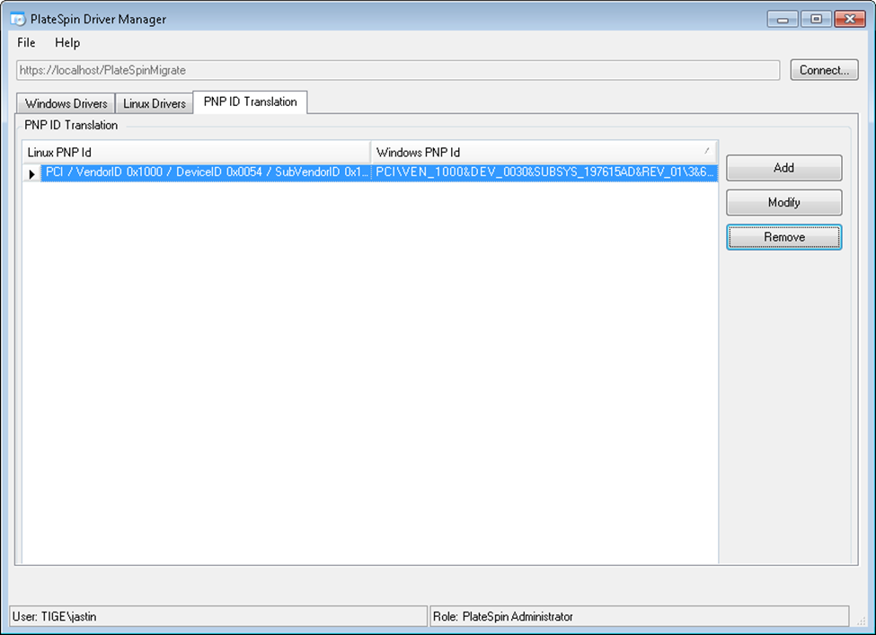 Estos ID reciben un formato coherente, por lo que PlateSpin puede aplicar una transformación estándar a cada uno de ellos para determinar su ID de PnP de Windows correspondiente. La traducción se produce de forma automática en el producto PlateSpin. La función permite al usuario o a un técnico de asistencia añadir, editar o eliminar asignaciones personalizadas de PnP.
