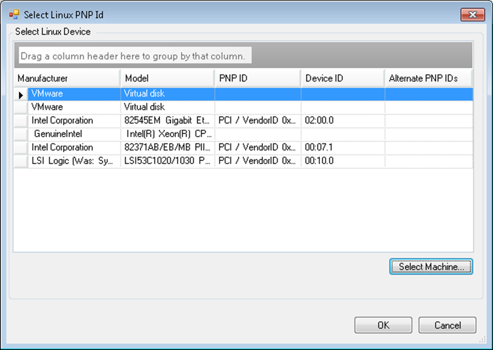 • En la pestaña Select Machine (Seleccionar equipo), haga clic en Select Machine (Seleccionar equipo) y en la lista de equipos Windows descubiertos con la función de descubrimiento activa, seleccione un equipo, haga clic en OK (Aceptar) para mostrar sus dispositivos, seleccione el ID de PnP que desee y haga clic en Modify (Modificar).