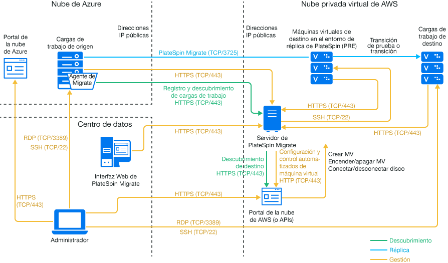Distribuya el servidor de PlateSpin Migrate desde Azure Marketplace en el entorno de Azure de origen. La imagen del servidor de Migrate en Azure Marketplace está preconfigurada para que admita su entorno de IaaS de Azure del host: Azure global o Azure China independiente. Si el servidor de Migrate y las cargas de trabajo de origen se encuentran en el mismo grupo de seguridad de red, puede utilizar el descubrimiento de Migrate para añadir los detalles de la carga de trabajo a Migrate. La Figura 12-2 muestra la ubicación de varios componentes en los entornos de AWS, Azure y de migración del centro de datos, así como las comunicaciones existentes entre ellos.