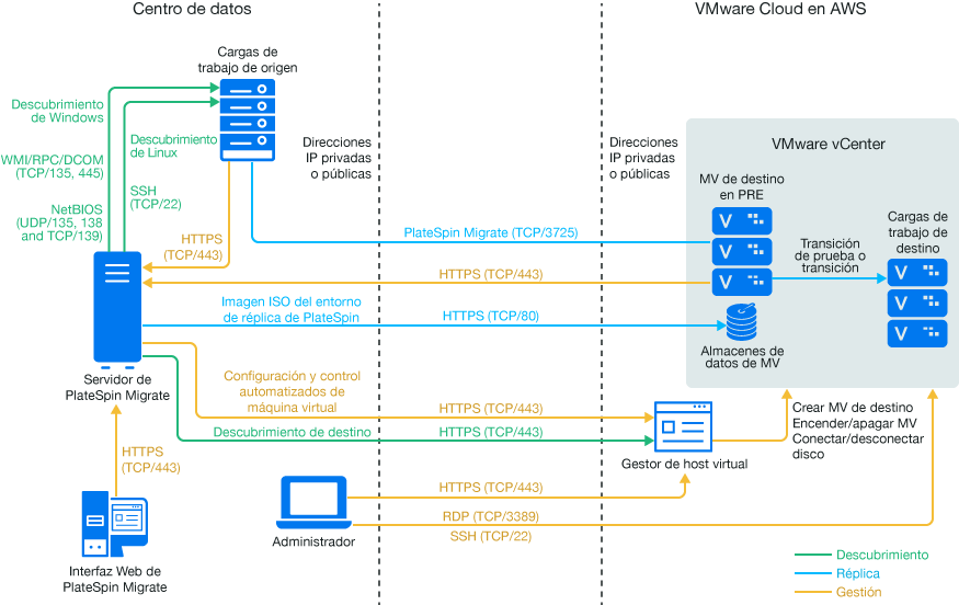 La Figura 13-1 muestra la ubicación de varios componentes en el entorno de migración de VMware automatizada, así como las comunicaciones entre ellos. La migración automatizada a VMware Cloud (VMC) en AWS solo se admite con la interfaz Web de PlateSpin Migrate.