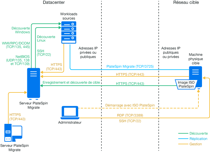 REMARQUE :la Figure 18-1 représente une découverte automatisée et les exigences réseau pour les workloads Windows et Linux. Vous pouvez également utiliser l'agent Migrate sur le workload source pour enregistrer le workload et envoyer les détails de son inventaire au serveur PlateSpin Migrate à l'aide de HTTPS (TCP/443). Reportez-vous aux sections Section 2.6.2, Conditions requises pour l'enregistrement de workloads et Section 22.7, Enregistrement de workloads et de découverte des détails avec l'agent Migrate.