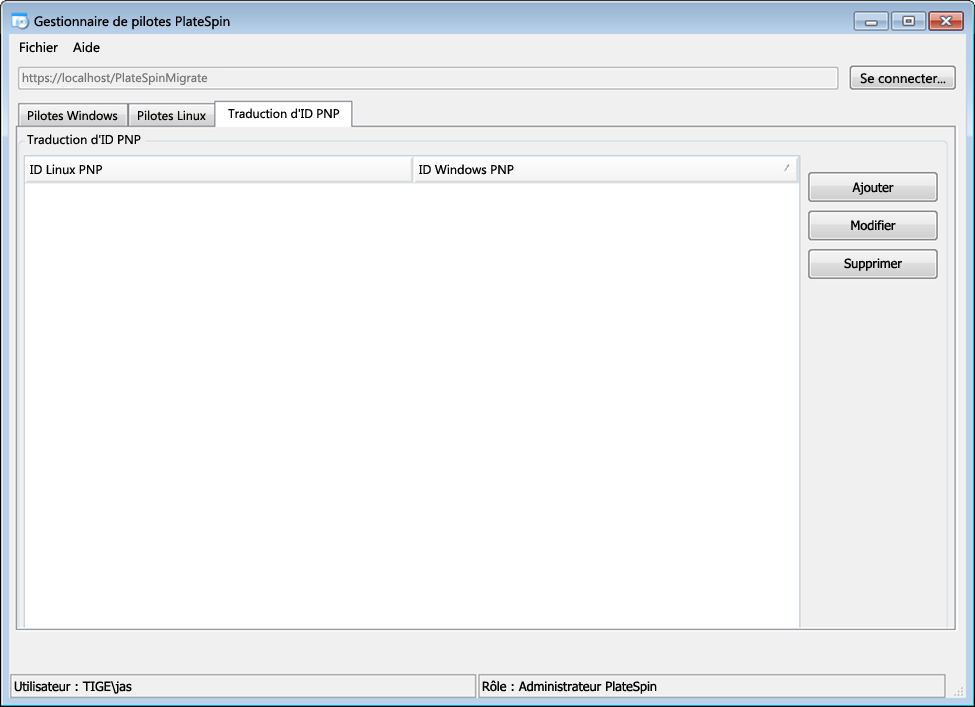 Dans l'outil Gestionnaire de pilotes PlateSpin, sélectionnez l'onglet Traduction d'ID PNP pour ouvrir la liste Traduction d'ID PNP qui contient les assignations d'ID PnP personnalisées connues.