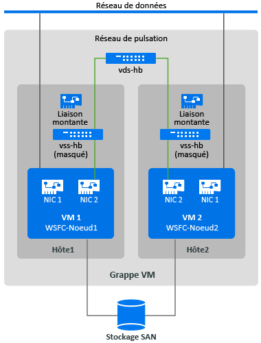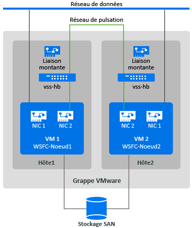 Pour créer un réseau de pulsation, vous pouvez configurer des commutateurs standard vSphere (vSphere Standard Switches, vSS) de manière identique sur chaque hôte et ajouter un groupe de ports de machine virtuelle pour le réseau de pulsation sur chaque commutateur. Chaque hôte fournit une carte d'interface réseau à utiliser en tant que liaison montante, laquelle est requise pour les communications entre les noeuds sur les différents hôtes. Vous configurez la seconde carte d'interface réseau sur chaque machine virtuelle de sorte qu'elle utilise le réseau de pulsation.