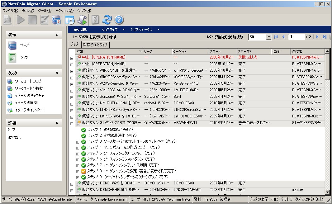 • [ジョブ]ビュー: [ジョブ]ビューには、検出、マイグレーション、およびイメージキャプチャなどのすべてのジョブが表示されます。詳細については、「セクション 3.2.3, [ジョブ]ビュー」を参照してください。