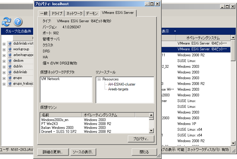 Distributed Resource Scheduler (DRS)クラスタに割り当てられているVMware ESXサーバは、クラスタの名前およびDRSの自動化レベル(完全、手動、または一部自動化)を表示します。VMware vCenterプラットフォームを構成するVMware ESXサーバのプロパティも、これを表示します。
