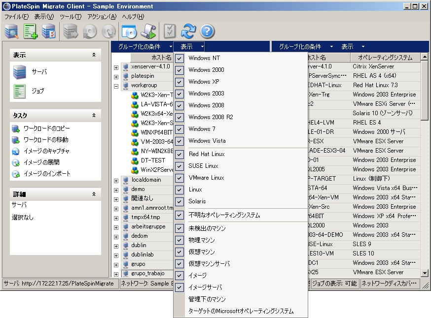 ソースワークロードおよびターゲットは、グループ化の条件および表示ドロップダウンメニューを使用して、オペレーティングシステム、ドメイン、名前、およびタイプに基づいてフィルタできます。グループ化の条件ドロップダウンメニューを使用して、[サーバ]ビューの項目をグループ化できます。次の項目でグループ化できます。