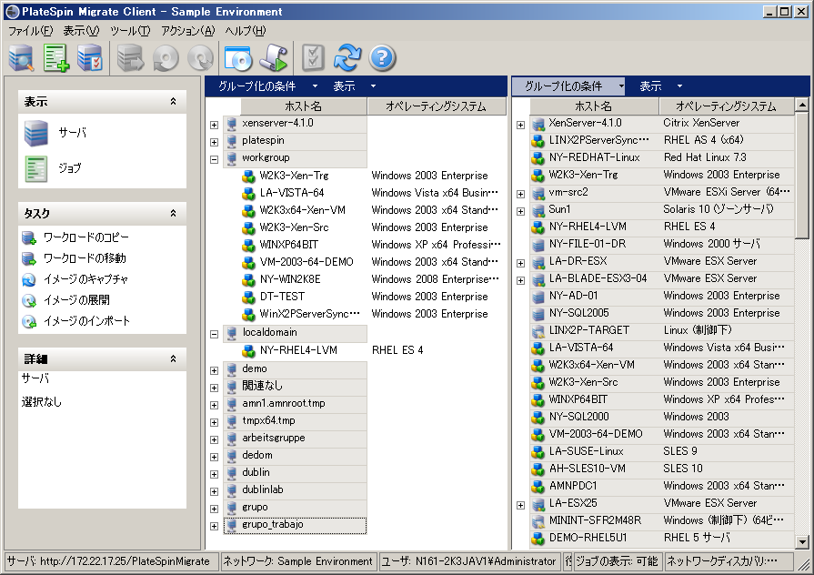 [サーバ]ビューでの項目の階層表示はそれぞれのプラットフォーム上での項目の構成を表しています。たとえば、VMはVMホストの下位にネストされて示され、PlateSpin Imageはイメージサーバの下位にあります。