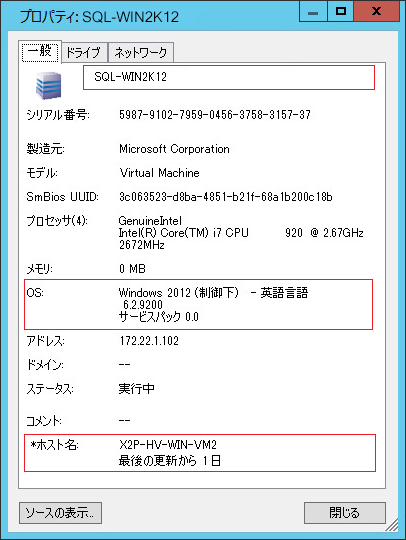 仮想マシンのプロパティは、ホスト、割り当てられたメモリの量、および処理能力に関する情報を含め、対応する仮想化プラットフォーム上でのマシンの環境に関連する情報を表示します。
