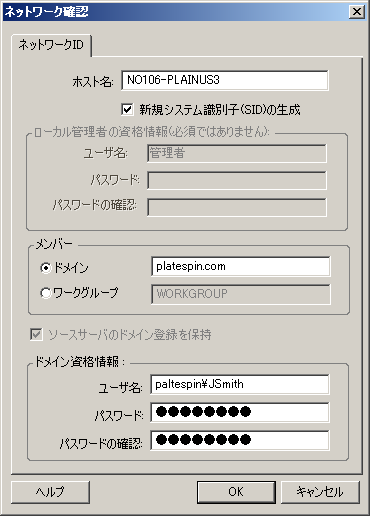 新しいSIDの生成: このオプションが選択されると、ターゲットワークロードは、新しいシステム識別子(SID)を割り当てます。資格情報は、Windows 2008システムにのみ必要で、ローカルの(埋め込まれた)管理者アカウントの資格情報でなければなりません。このアカウントがローカルにソース上で名前を変更された場合、新しい名前を提供します。