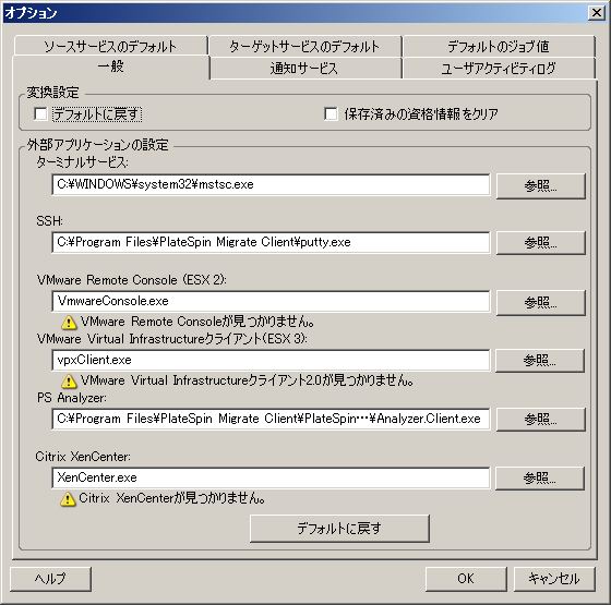 Clientでは、PlateSpin Migrate Client内から起動できる外部アプリケーションに対して、デフォルト設定の復元、保存された資格情報の消去、および実行可能ファイルの場所の指定を行うことが可能です。