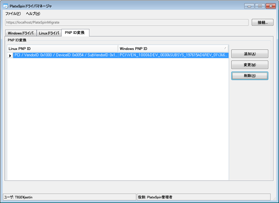 それらのIDは一貫してフォーマットされているので、PlateSpinは、それぞれに標準変換を適用して、対応するWindows PnP IDを決定できます。変換は、PlateSpin製品内で自動的に行われます。この機能を使用して、管理者またはサポート技術者は、カスタムのPnPマッピングを追加、編集、または削除することができます。