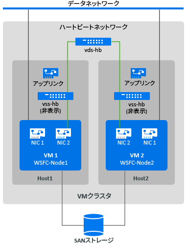ハートビートネットワークを作成するには、VMwareクラスタ上にvSphere分散スイッチを設定して、分散スイッチのハートビートネットワーク用の仮想マシンのポートグループを追加することもできます。ホストをハートビートのポートグループに追加します。この設定では、含めるすべてホストにわたってネットワーク設定とハートビートのポートグループを容易に管理できます。メンバーホスト上に非表示のvSSスイッチが自動的に作成されます。各ホストはアップリンクとして使用できるNICを提供します。このアップリンクは、複数のホストにわたるノード間で通信するために必要です。各VMの2つ目のNICを、このハートビートネットワークを使用するように設定します。