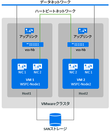 ハートビートネットワークを作成するには、各ホストに同じvSphere標準スイッチ(vSS)を設定し、各スイッチのハートビートネットワークに対して仮想マシンのポートグループを追加できます。各ホストはアップリンクとして使用できるNICを提供します。このアップリンクは、複数のホストにわたるノード間で通信するために必要です。各VMの2つ目のNICを、このハートビートネットワークを使用するように設定します。