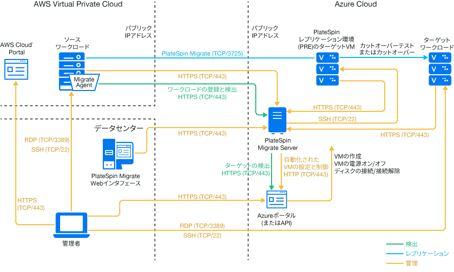 Amazon Web Services EC2 CloudからMicrosoft Azure Cloudへのワークロードのマイグレーションでは、ターゲットAzure環境にPlateSpin Migrate Serverを展開します。関係するサイト間にVPNは必要ありません。インターネットアクセスとパブリックIPアドレスは必要です。図 12-1に、AWS、Azure、データセンターマイグレーション環境のさまざまなコンポーネントの所在とそれらのコンポーネント間の通信を示します。