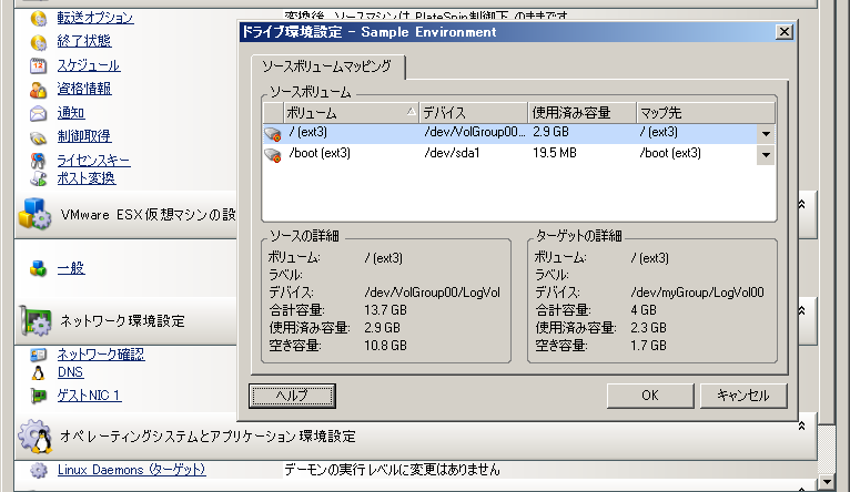 Linuxワークロードのサーバ同期ジョブは、ソースおよびターゲットの詳細なマウントポイントおよびボリュームの情報を提供し、必要なマッピングを指定することができます。