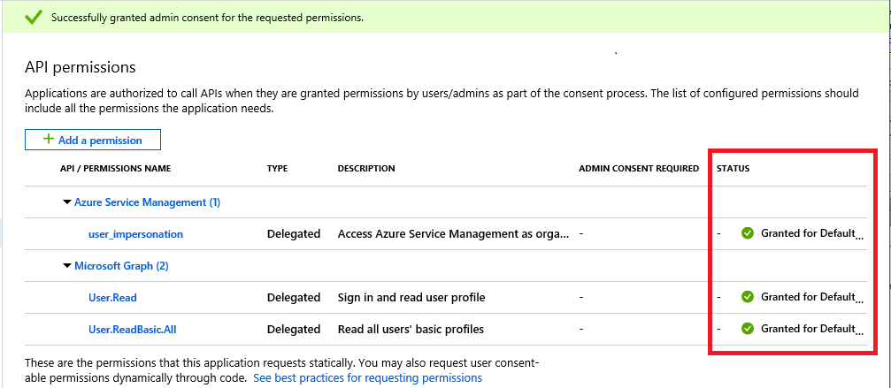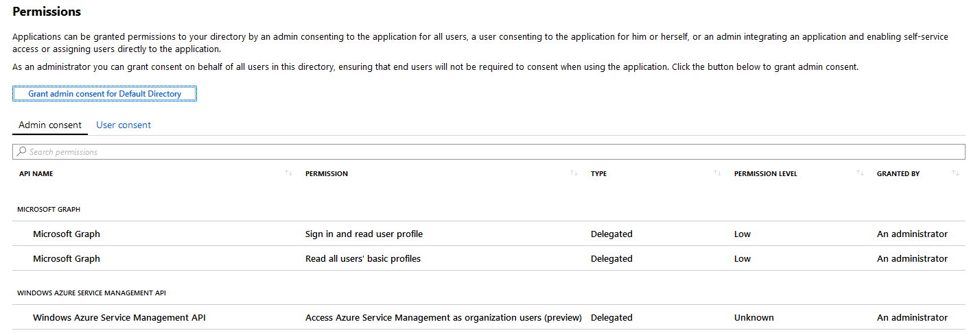 4. Verify that required permissions are listed in the Admin Consent section and that consent is granted for the Default Directory.