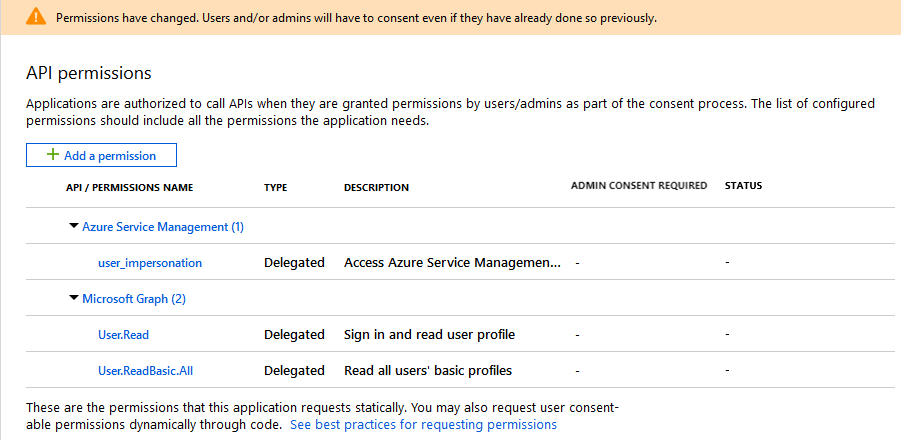 5. On the API Permissions page, visually verify that Azure Service Management is listed in the API permissions list with Delegated permissions for user_impersonation.