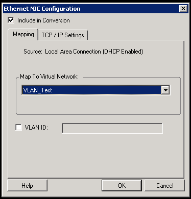 Map to Virtual Network: From the drop-down list, select the virtual switch or network to use for communication during an Offline migration. If multiple virtual network adapters are present, select the adapter that can communicate with both the PlateSpin Server and the source machine. This network can differ from the network on which the target virtual machine will run after the migration. VLAN ID: (Applicable for target machine on a Hyper-V server only) Enable this option to specify the virtual network ID to be used on the target machine. If you do not specify this ID, then the virtual network ID of the source machine is used by default. TCP/IP Settings tab: Click the tab to access TCP/IP and advanced network settings. See TCP/IP and Advanced Network Settings. |