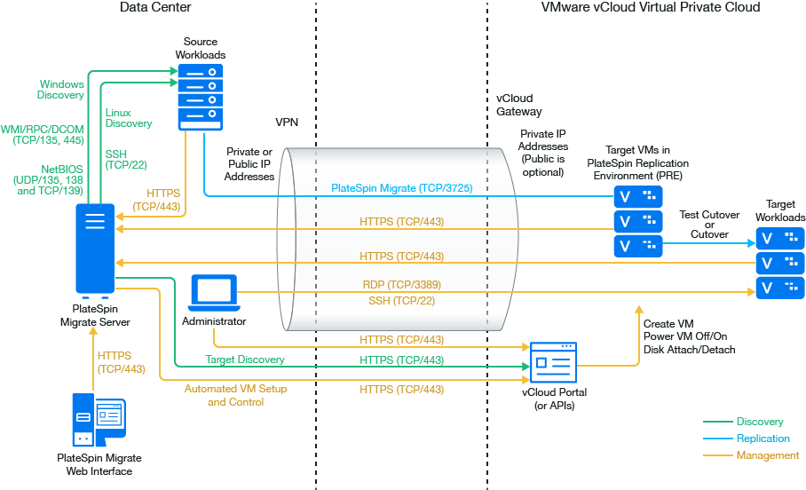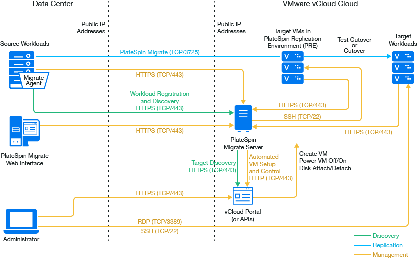 You can deploy a PlateSpin Migrate server on premise in your data center with the source workloads or in the appropriate VMware vCloud Organization.