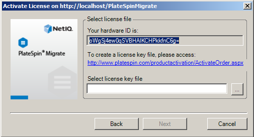 Na Interface da Web do PlateSpin Migrate, na página License Activation, navegue até o local do arquivo de chave de licença e, em seguida, clique em Activate.