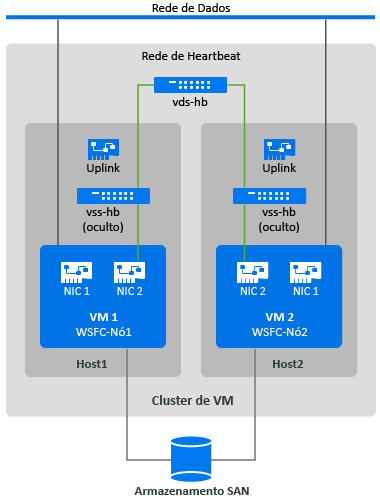 Para criar uma rede de heartbeat, você pode você também configurar um Switch Distribuído do vSphere no Cluster do VMware e adicionar um grupo de portas de máquina virtual para a rede de heartbeat no switch distribuído. Adicione os hosts ao grupo de portas de heartbeat. Essa configuração facilita o gerenciamento das configurações de rede e do grupo de portas de heartbeat em todos os hosts que você pretende incluir. Switches de vSS ocultos são criados automaticamente nos hosts membros. Cada host contribui com uma NIC disponível a ser usada como uplink, que é necessário para comunicação entre nós nos hosts. Configure a segunda NIC em cada VM para usar a rede de heartbeat.